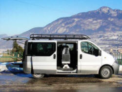 su richiesta ns minibus dotatodi portapacchi al tetto con scala e camminatoio per trasporto di handbike, canoe, gommone, bike, slitte, ecc